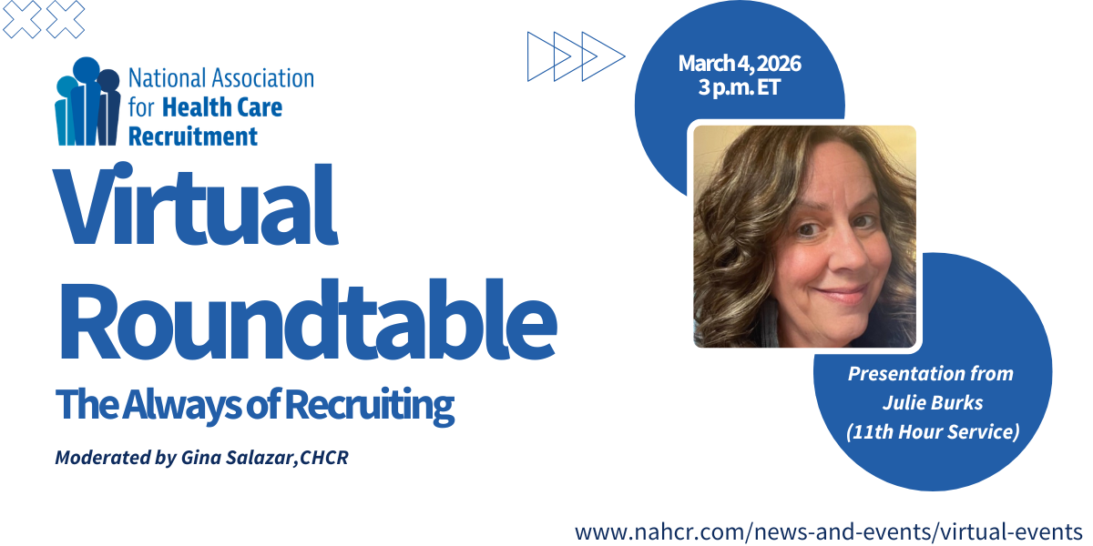 Providing health care recruitment professionals education, networking, and resources to become strategic business partners within a dynamic health care environment. NAHCR members connect through an exclusive online community, stay informed with webinars and The Hiring Scope podcast, and enjoy leadership, certification, and conference opportunities that foster lasting professional growth.